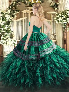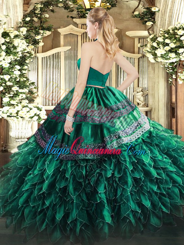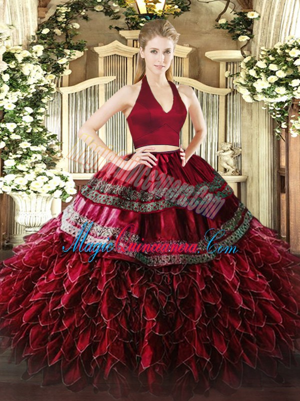 Halter Top Sleeveless Vestidos de Quinceanera Floor Length Appliques and Ruffles Wine Red Organza