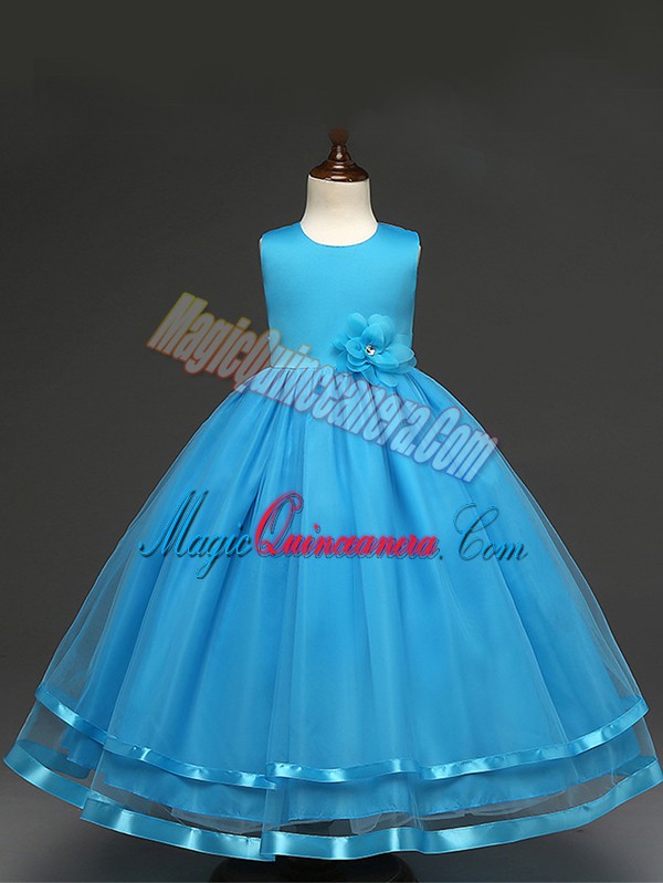 , Hand Made Flower Evening Gowns Baby Blue Zipper Sleeveless Floor Length