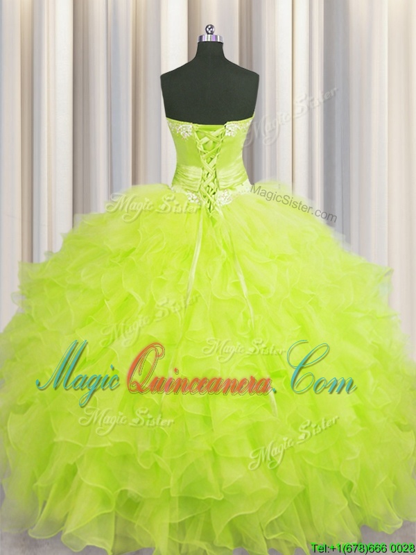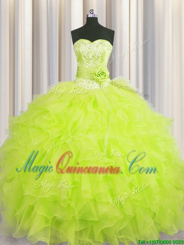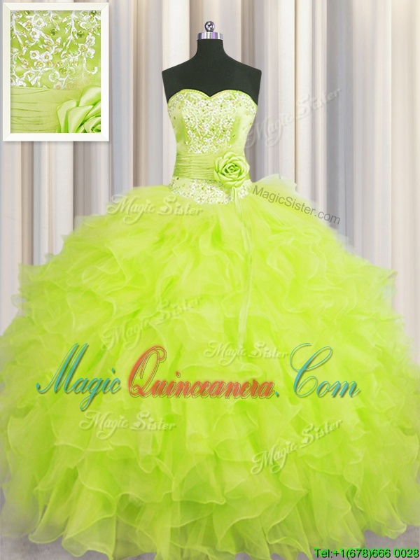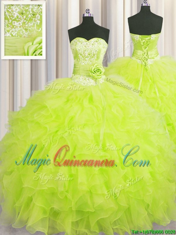 Handcrafted Flower Yellow Green Ball Gowns Sweetheart Sleeveless Organza Floor Length Lace Up Beading and Ruffles and Hand Made Flower Quince Ball Gowns