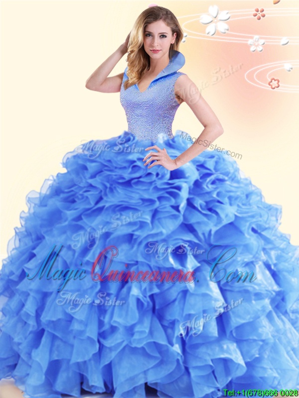 High Class Blue Ball Gown Prom Dress Military Ball and Sweet 16 and Quinceanera and For with Beading and Ruffles High-neck Sleeveless Backless