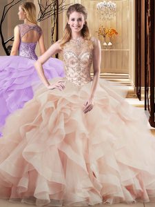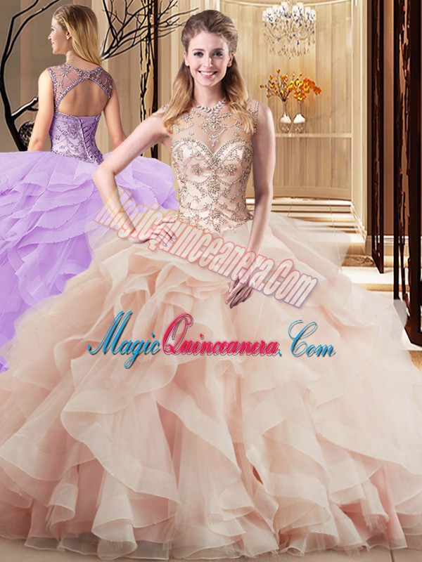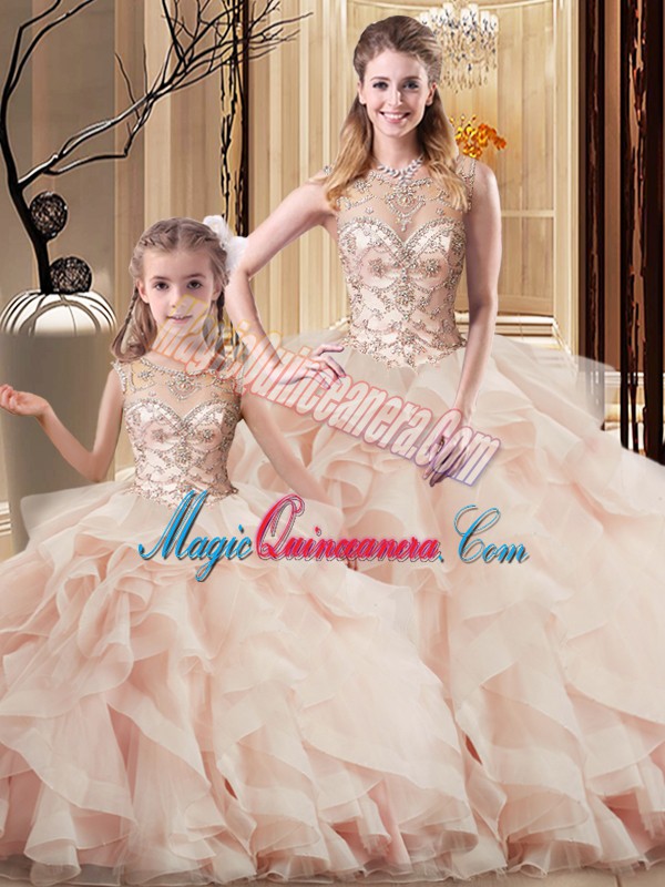 High Class Brush Train Ball Gowns Quinceanera Dresses Peach Scoop Tulle Sleeveless Lace Up
