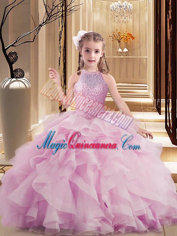 High Class High-neck Sleeveless Lace Up Kids Formal Wear Lilac Tulle