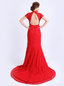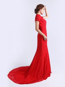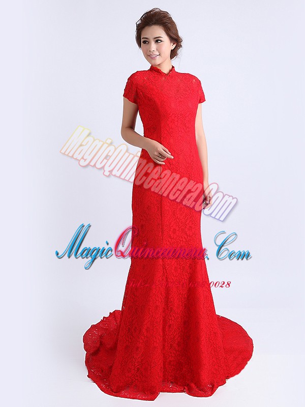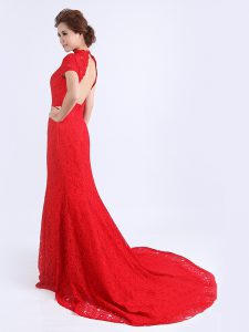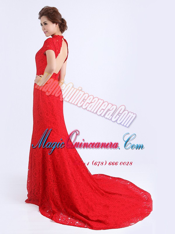 High Class Lace Cap Sleeves With Train Mother Of The Bride Dress Brush Train and Lace