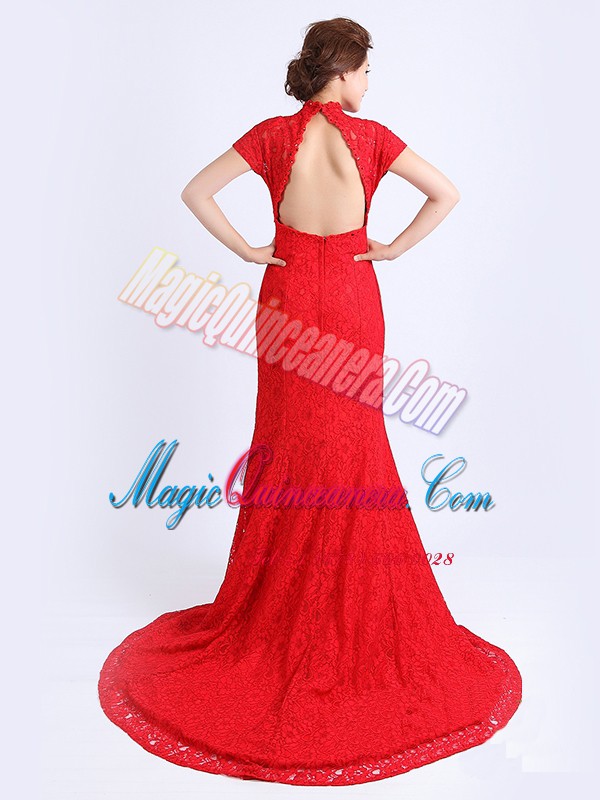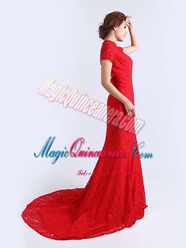 High Class Lace Cap Sleeves With Train Mother Of The Bride Dress Brush Train and Lace - Magic Quinceanera