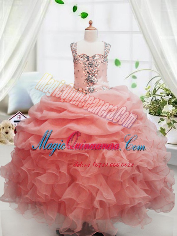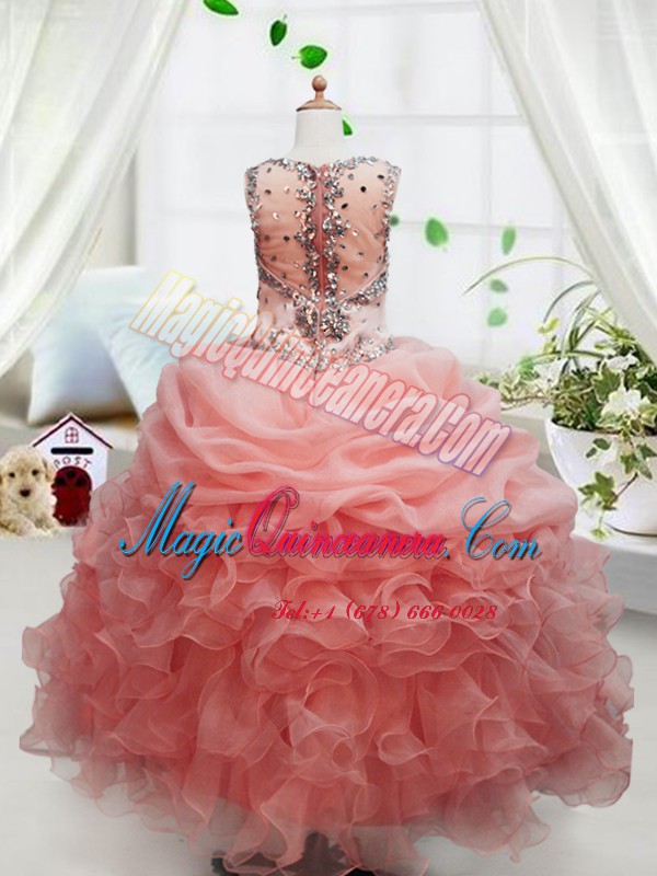 High Class Peach Ball Gowns Beading and Ruffles and Pick Ups Little Girls Pageant Dress Wholesale Zipper Organza Sleeveless Floor Length