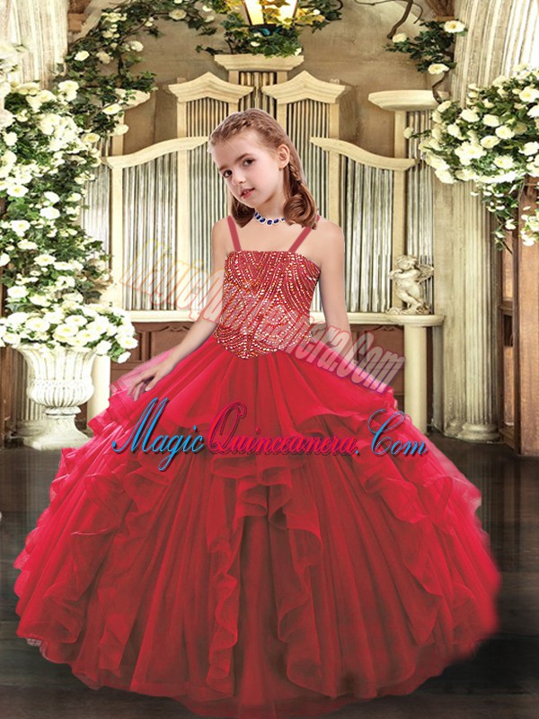 High Class Red Ball Gowns Straps Sleeveless Organza Floor Length Lace Up Beading and Ruffles Pageant Dress Wholesale