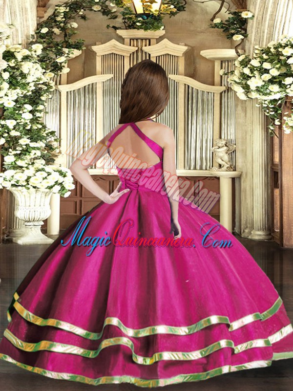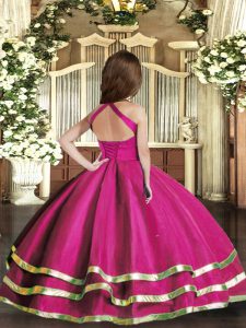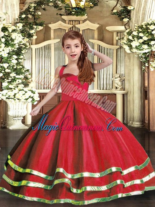 High Class Red Ball Gowns Tulle Straps Sleeveless Ruffled Layers and Ruching Floor Length Lace Up Pageant Gowns For Girls