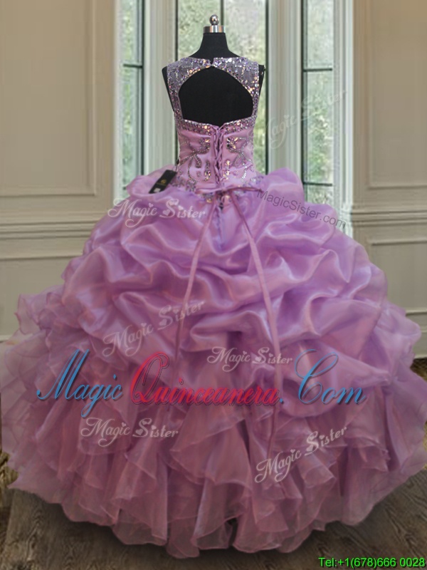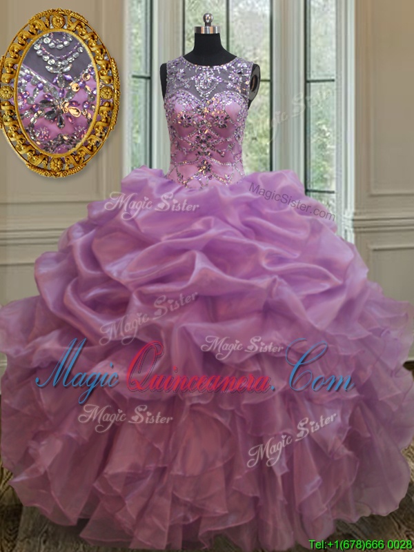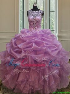 High Class See Through Scoop Sleeveless Lace Up Quince Ball Gowns Lilac Organza