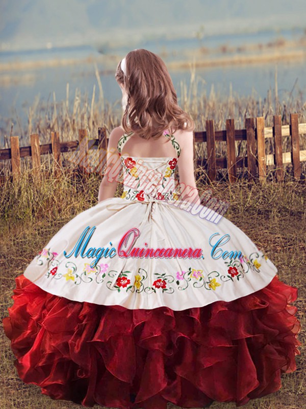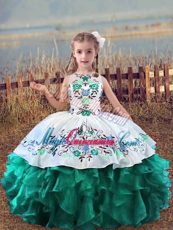 High Class Turquoise Scoop Neckline Embroidery and Ruffles Little Girl Pageant Dress Sleeveless Lace Up