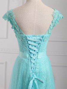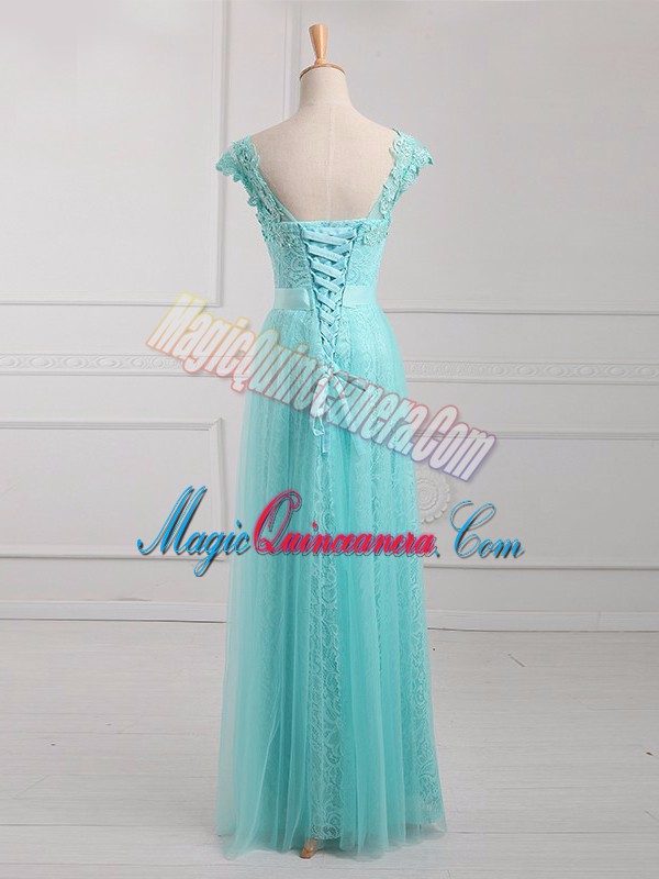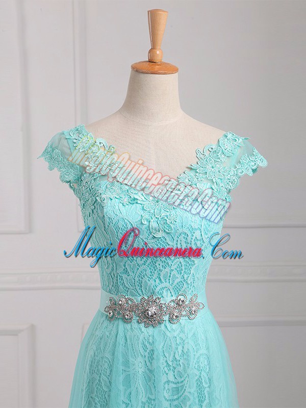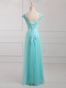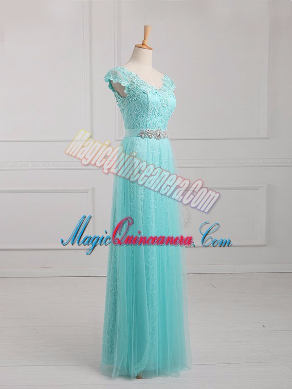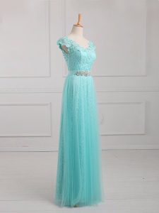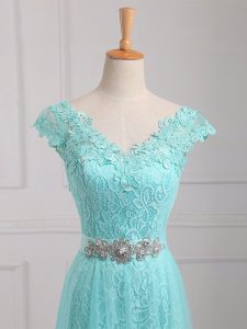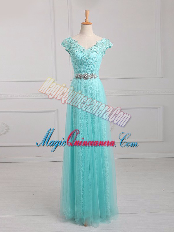 High Class V-neck Cap Sleeves Mother of the Bride Dress Floor Length Beading and Appliques Aqua Blue Tulle and Lace