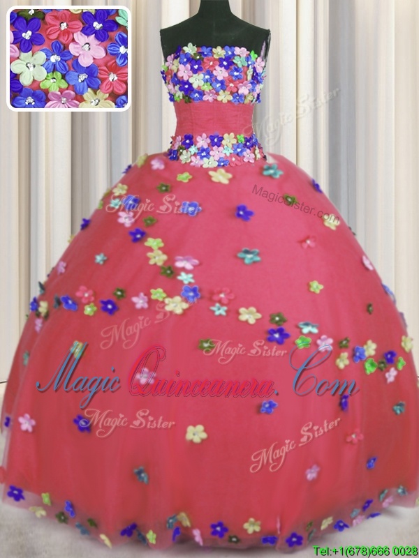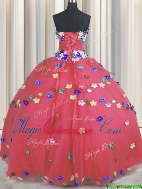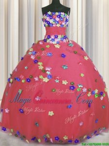 High End Coral Red Lace Up Quinceanera Dress Hand Made Flower Sleeveless Floor Length