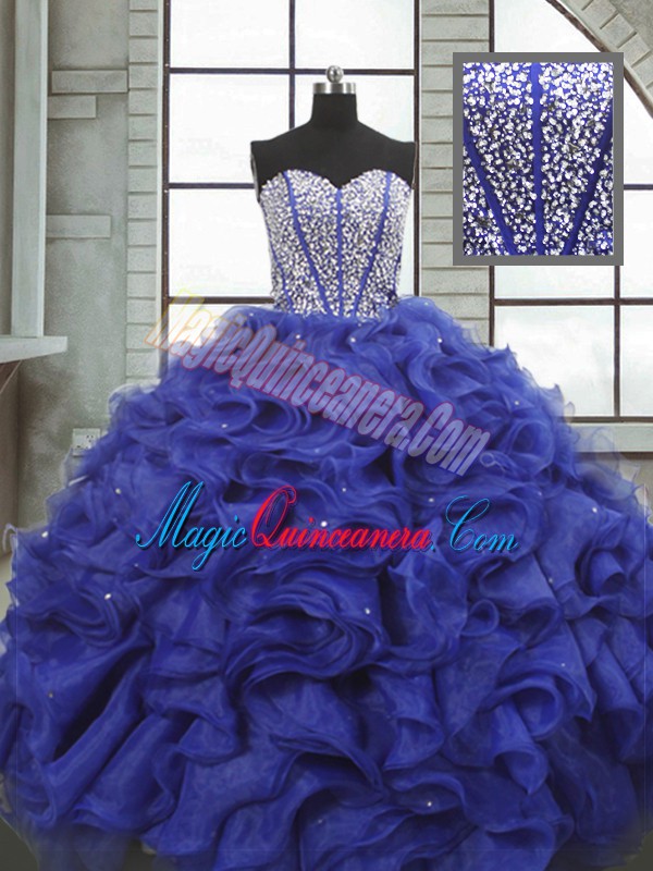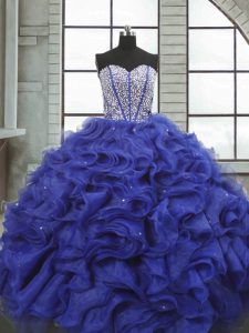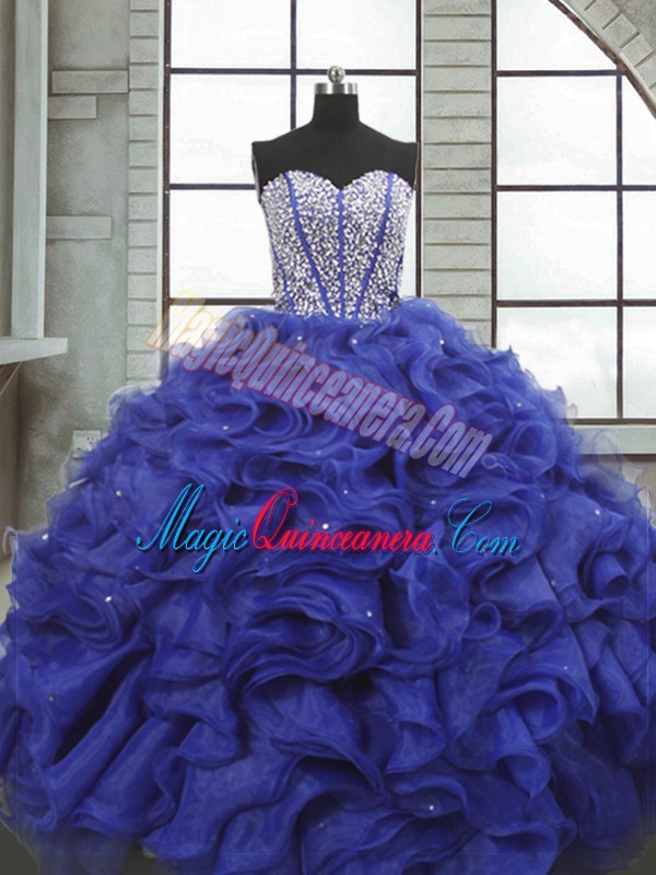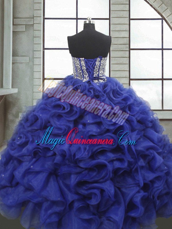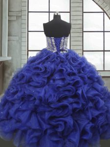 High End Floor Length Blue 15 Quinceanera Dress Organza Sleeveless Beading and Ruffles