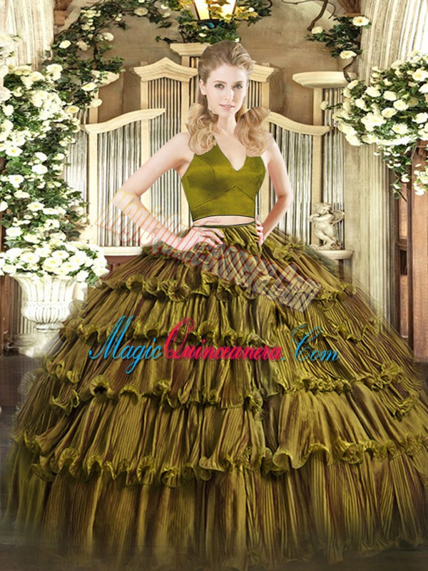 High End Floor Length Olive Green Quinceanera Dresses Organza Sleeveless Ruffled Layers