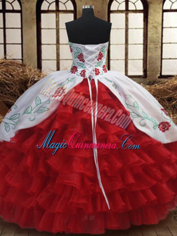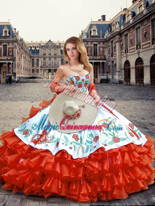 High End Floor Length Orange Red Sweet 16 Dress Organza Sleeveless Embroidery and Ruffled Layers