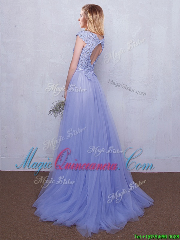 High End Scoop Cap Sleeves Tulle With Brush Train Backless Quinceanera Dama Dress in Lavender for with Lace and Belt