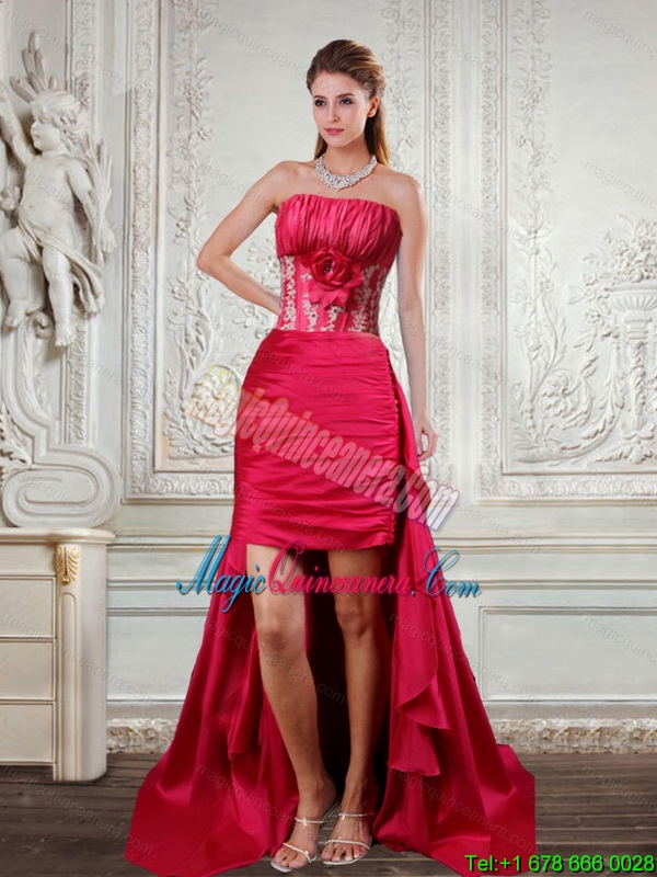 High Low Discount Strapless Ruffles Coral Red Dama Dresses with Hand Made Flower