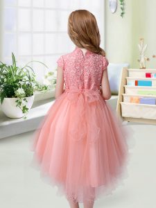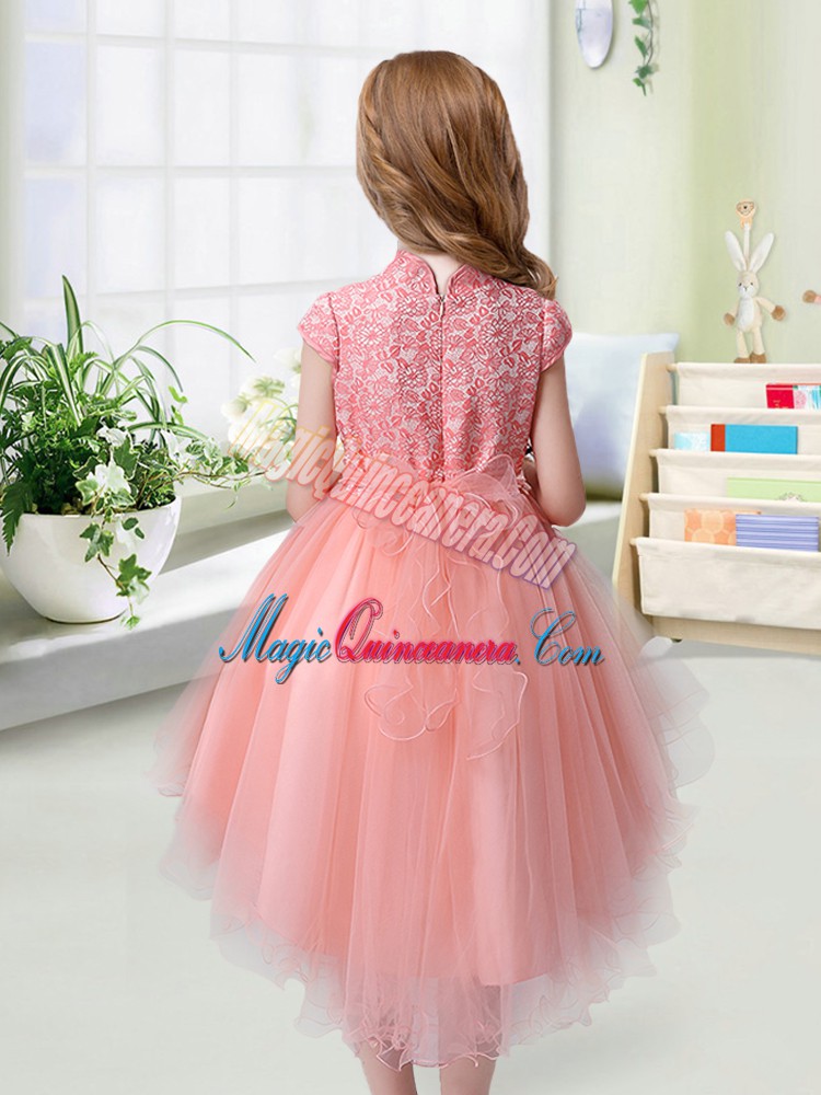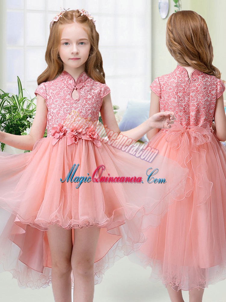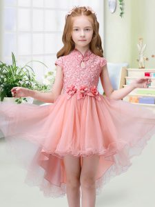 High Low Peach Little Girl Pageant Dress Organza Cap Sleeves Lace and Hand Made Flower