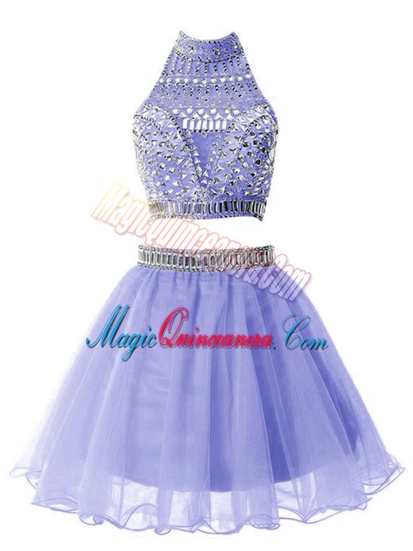 High-neck Sleeveless Dama Dress for Quinceanera Knee Length Beading Lavender Organza