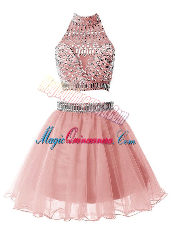 High-neck Sleeveless Dama Dress Knee Length Beading Pink Organza