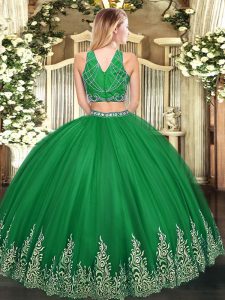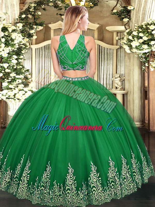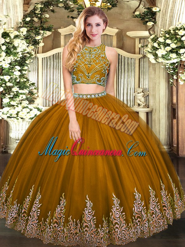 , High-neck Sleeveless Sweet 16 Dress Floor Length Beading and Appliques Brown Tulle