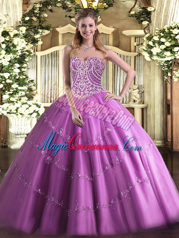 High Quality Lilac Ball Gowns Tulle Sweetheart Sleeveless Beading Floor Length Lace Up Quince Ball Gowns