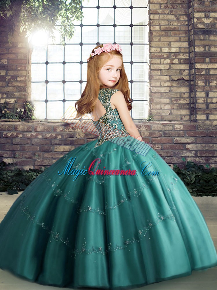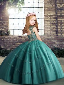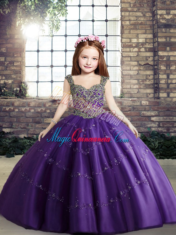 High Quality Sleeveless Tulle Floor Length Lace Up Little Girl Pageant Dress in Purple with Beading