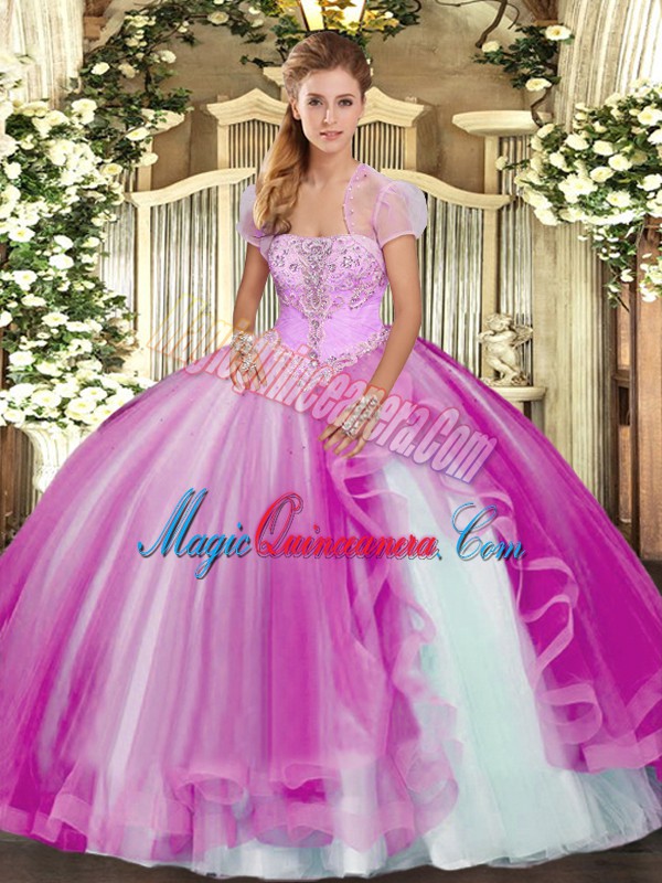 High Quality Strapless Sleeveless Sweet 16 Quinceanera Dress Floor Length Appliques and Ruffles Fuchsia Tulle