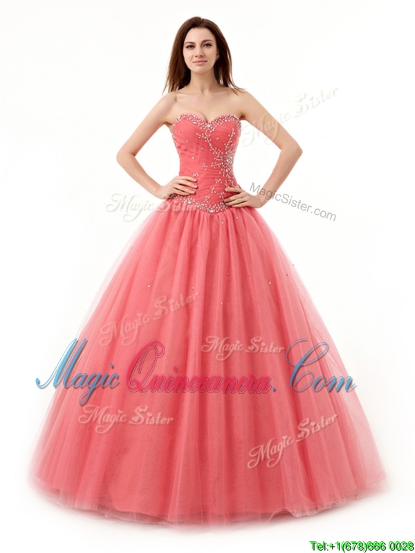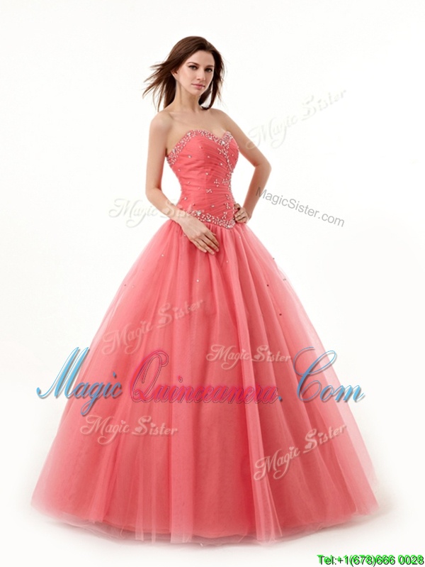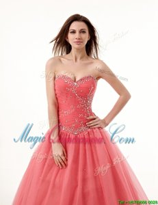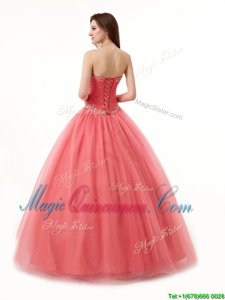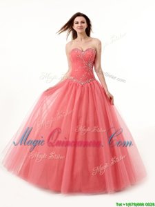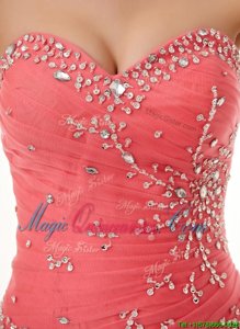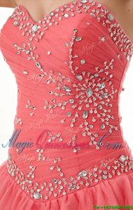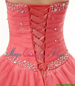 High Quality Sweetheart Sleeveless Sweet 16 Quinceanera Dress Floor Length Beading and Ruching Watermelon Red Tulle