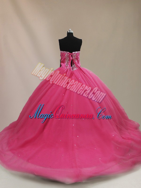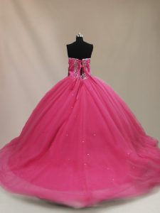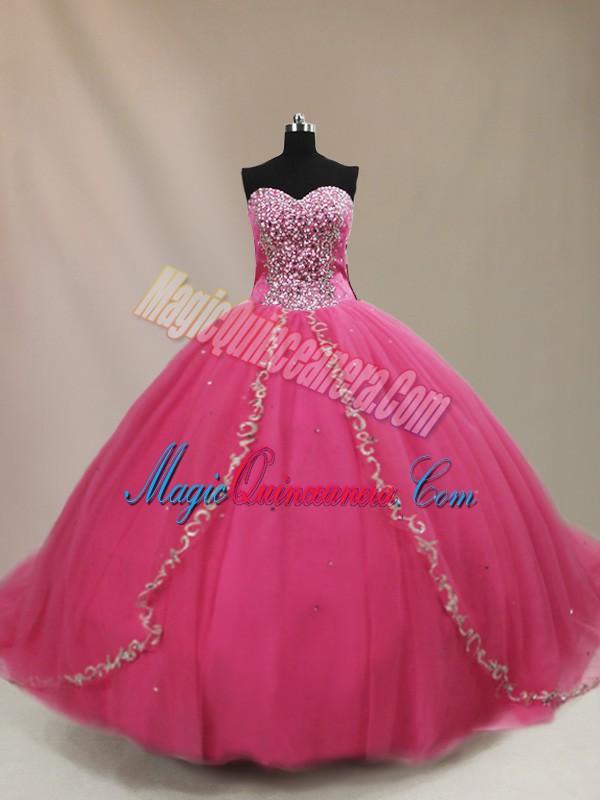 Hot Pink Ball Gowns Beading Sweet 16 Quinceanera Dress Lace Up Tulle Sleeveless