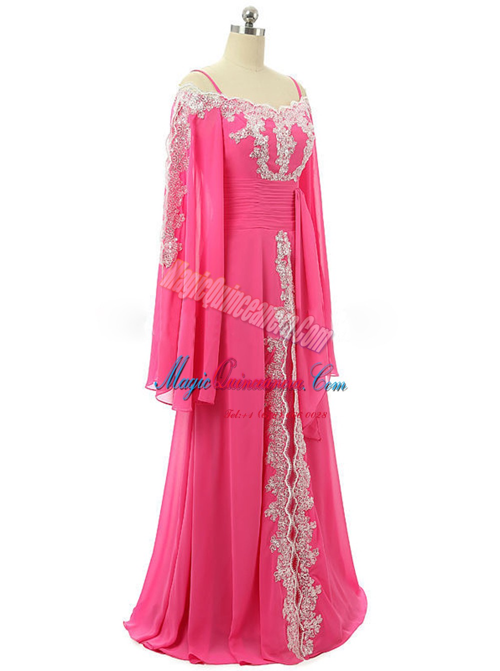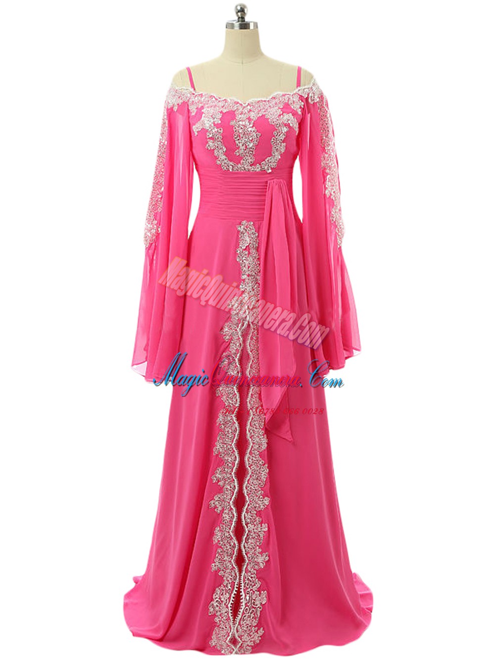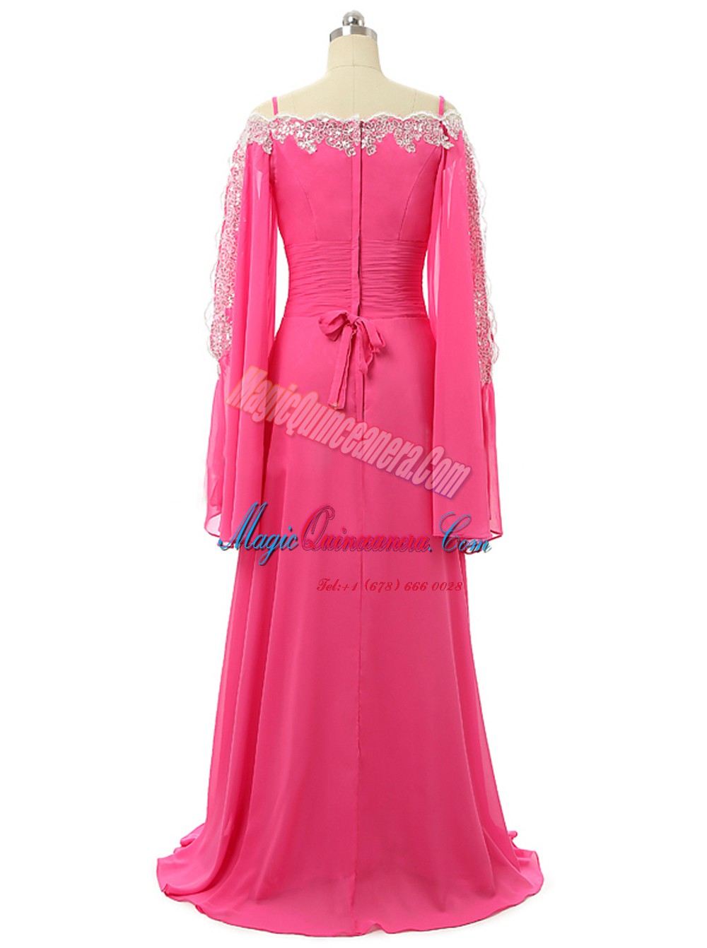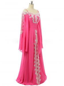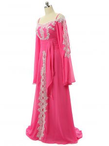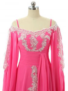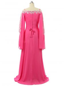 , Hot Pink Chiffon Zipper Prom Gown Long Sleeves Sweep Train Lace and Sequins