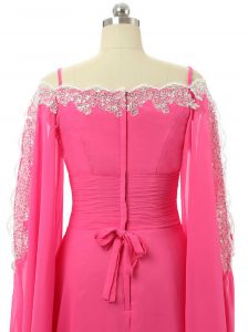 Hot Pink Chiffon Zipper Prom Gown Long Sleeves Sweep Train Lace and Sequins
