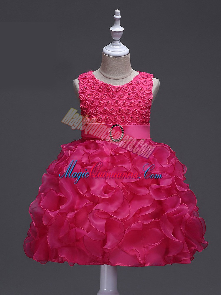 Hot Pink Lace Up Kids Formal Wear Ruffles and Belt Sleeveless Knee Length