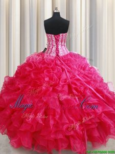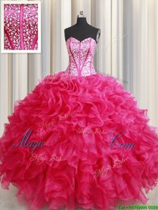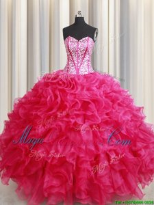 Hot Pink Lace Up Sweetheart Beading and Ruffles Sweet 16 Quinceanera Dress Organza Sleeveless