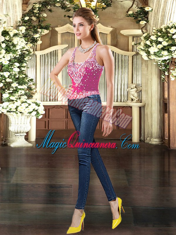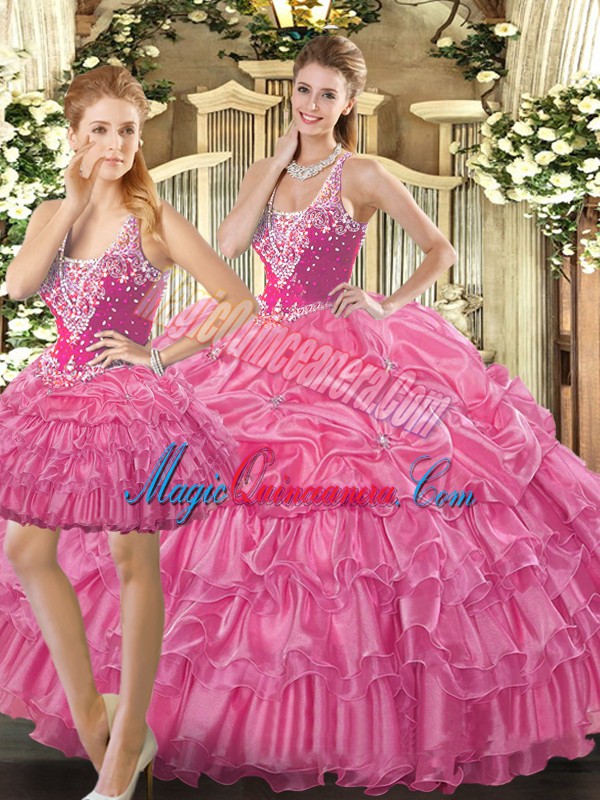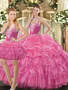 Hot Pink Sleeveless Beading and Ruffles and Pick Ups Floor Length Sweet 16 Quinceanera Dress