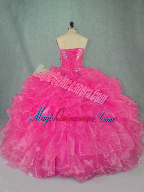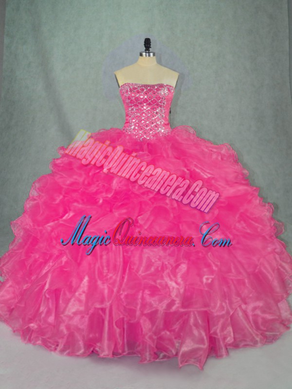 , Hot Pink Sleeveless Beading and Ruffles Floor Length Quinceanera Dresses