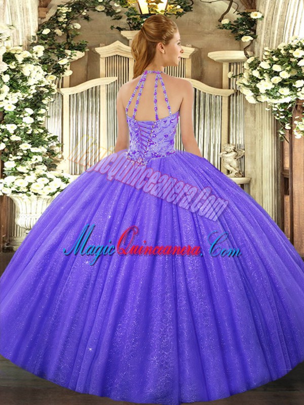 Hot Pink Tulle Lace Up Halter Top Sleeveless Floor Length Quinceanera Gowns Beading and Embroidery