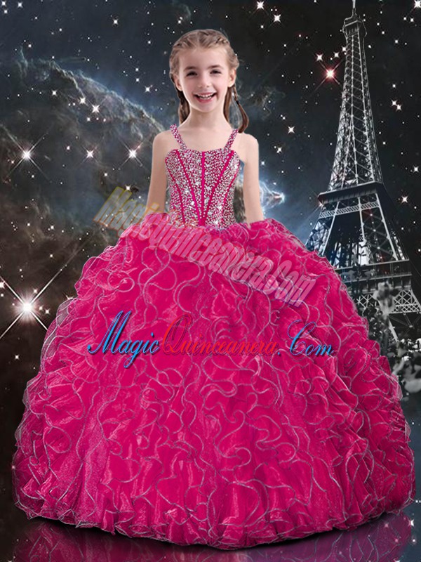 Hot Sale Floor Length Fuchsia Pageant Dress for Girls Organza Sleeveless Beading and Ruffles