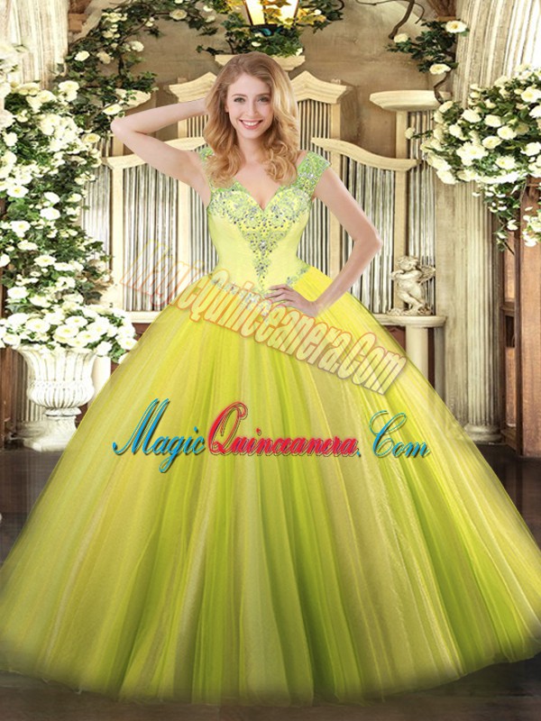 Hot Selling Ball Gowns Sweet 16 Quinceanera Dress Yellow Green V-neck Tulle Sleeveless Floor Length Lace Up