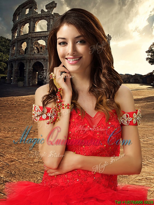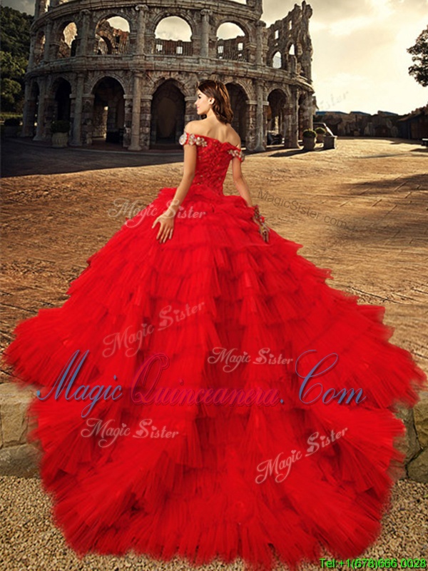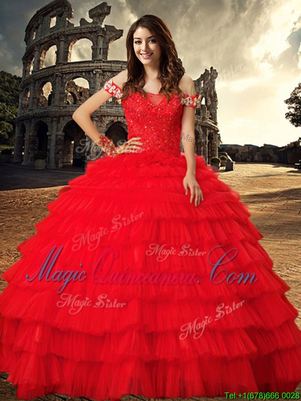 Hot Selling Red Ball Gowns Off The Shoulder Sleeveless Tulle With Train Chapel Train Lace Up Beading and Ruffled Layers Sweet 16 Dresses