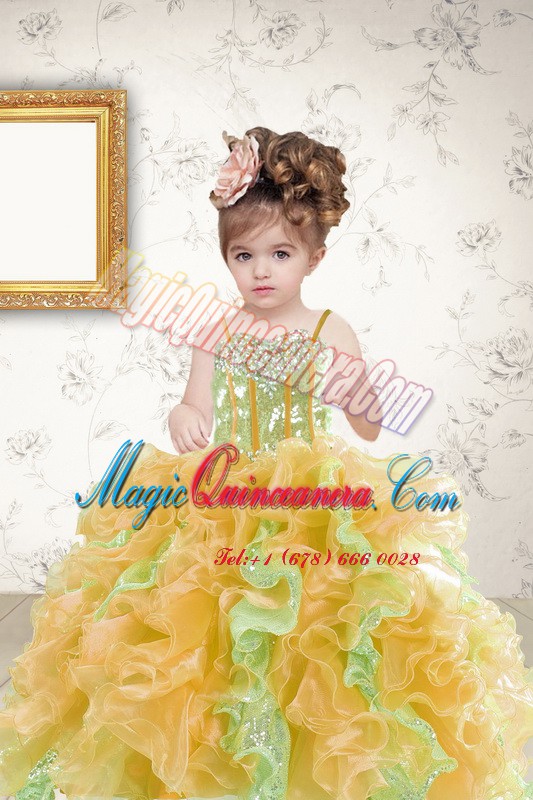 Hot Selling Spaghetti Straps Sleeveless Pageant Dress Wholesale Floor Length Beading and Ruffles and Sequins Multi-color Organza