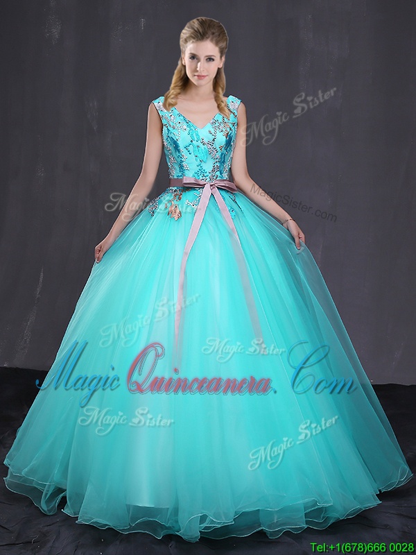 , Ideal Aqua Blue Sleeveless Appliques and Belt Floor Length Ball Gown Prom Dress