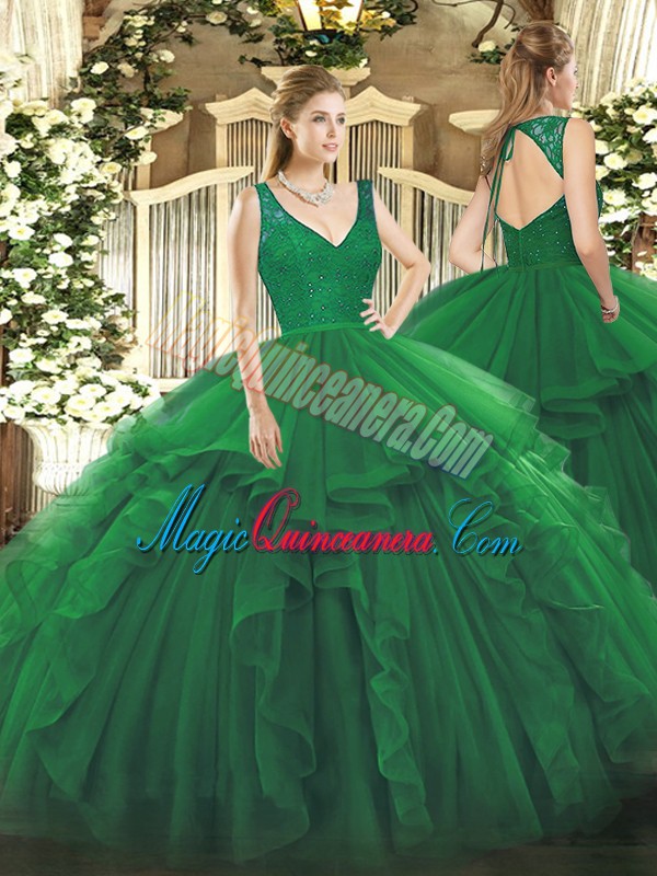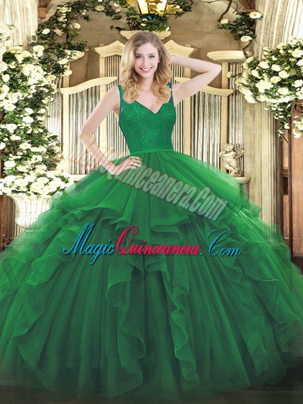 Ideal V-neck Sleeveless Zipper Sweet 16 Dresses Dark Green Organza