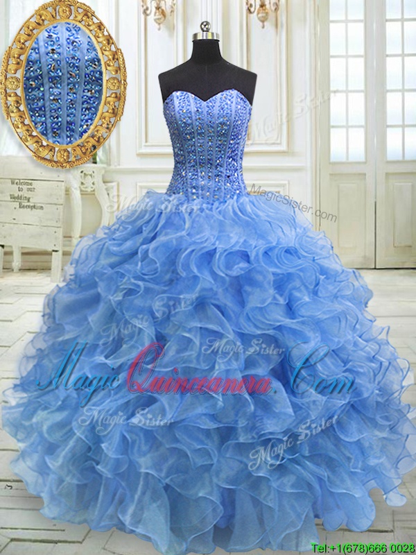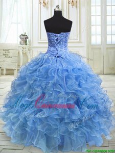 Adorable Blue Lace Up Sweetheart Beading and Ruffles Quinceanera Gown Organza Sleeveless