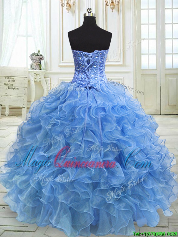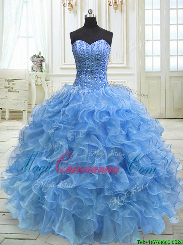 Inexpensive Baby Blue Lace Up Sweetheart Beading and Ruffles Vestidos de Quinceanera Organza Sleeveless
