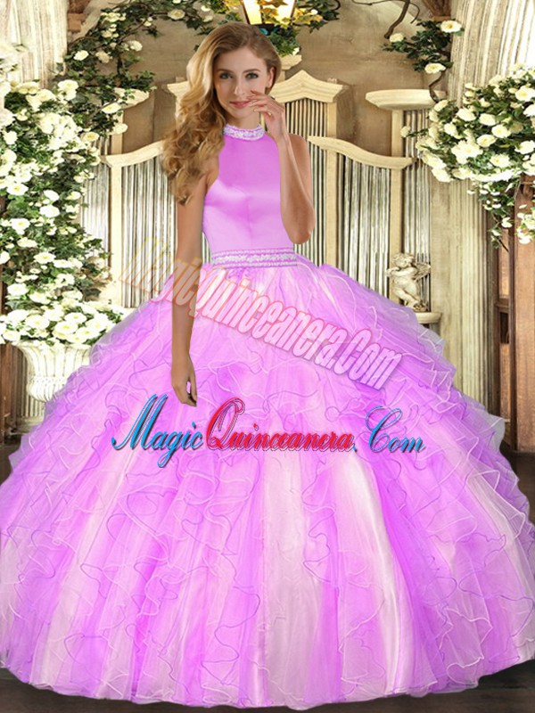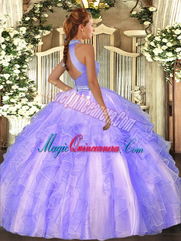 Inexpensive Halter Top Sleeveless Organza Quince Ball Gowns Beading and Ruffles Backless