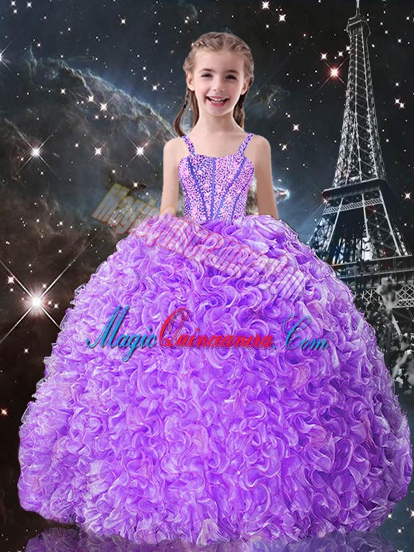 Inexpensive Lilac Pageant Gowns For Girls Quinceanera and Wedding Party with Beading and Ruffles Straps Sleeveless Lace Up