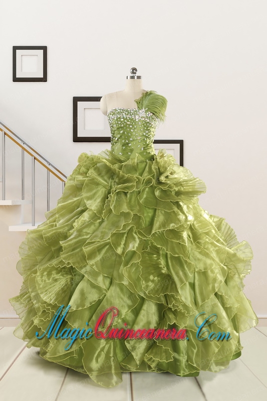 , Inexpensive Olive Green Dresses for Quince with Beading and Ruffles