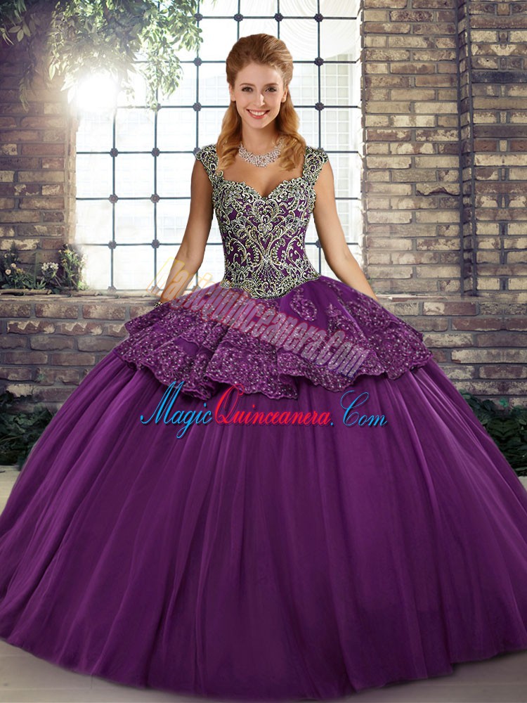 Inexpensive Purple Tulle Lace Up Straps Sleeveless Floor Length Quinceanera Dresses Beading and Appliques
