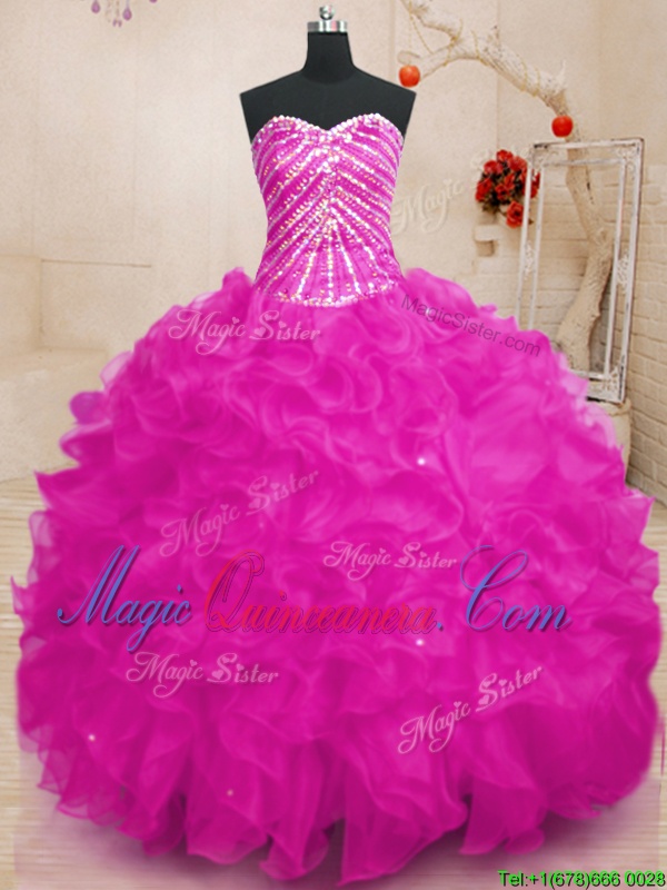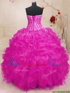 Inexpensive Sleeveless Floor Length Beading and Ruffles and Sequins Lace Up 15 Quinceanera Dress with Fuchsia