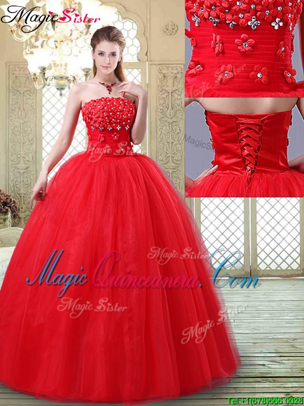 , Inexpensive Strapless Quinceanera Dresses with Hand Made Flowers